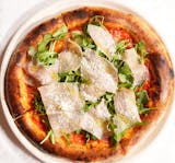 Pizza sauce, mozzarella, arugula topped, prosciutto di Parma & parmesan cheese.