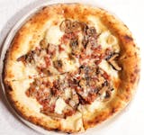 Mozzarella, wild mushrooms, bacon, parmesan cheese & white truffle oil.